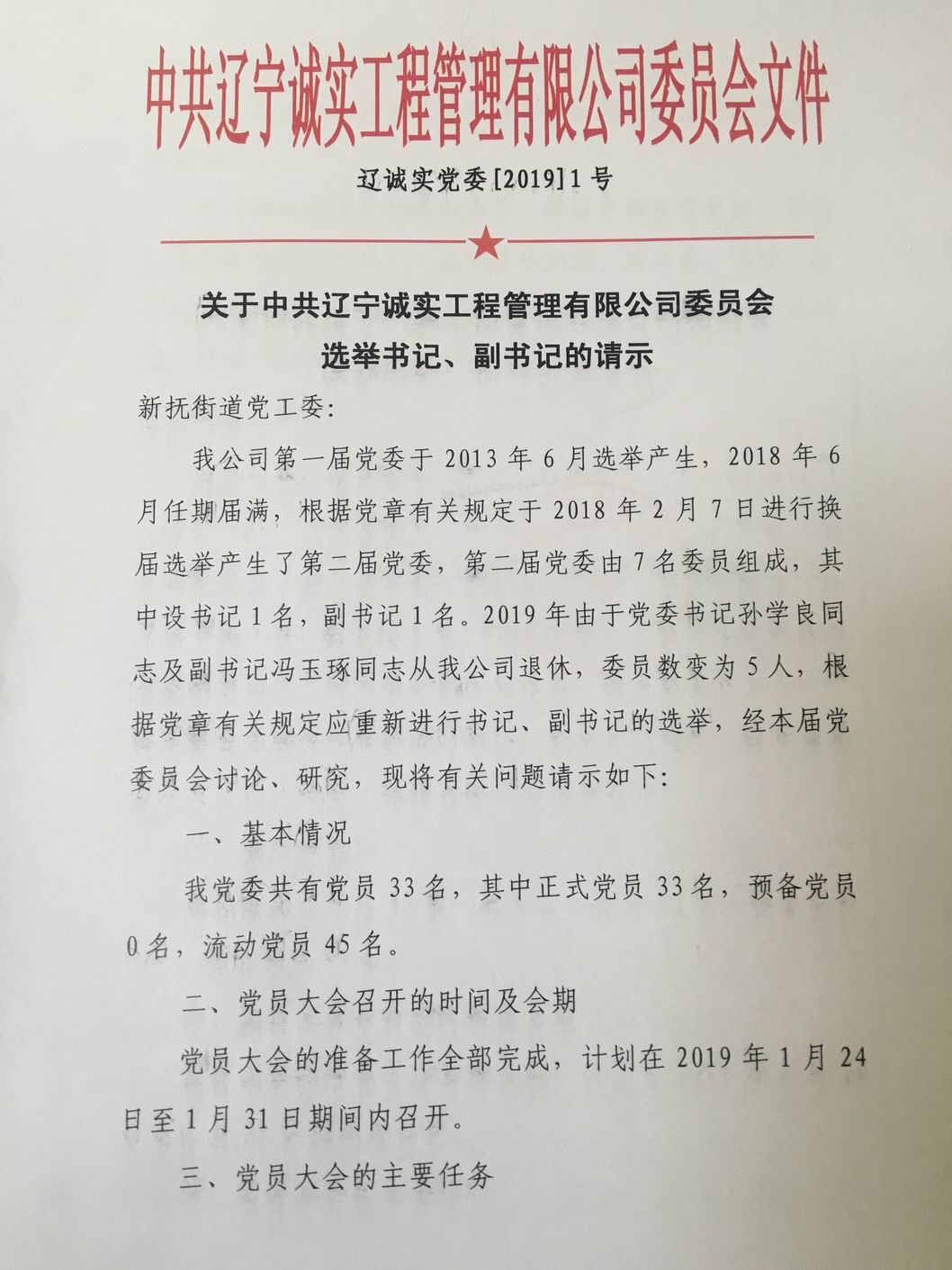 我公司第一屆黨委于2013年6月選舉產生,2018年6月任期屆滿,根據黨章有關規定于2018年2月7日進行換屆選舉產生了第二屆黨委,第二屆黨委由7名委員組成,其中設書記1名,副書記1名。2019年由于黨委書記孫學良同志及副書記馮玉琢同志從我公司退休,委員數變為5人,根據黨章有關規定應重新進行書記、副書記的選舉。我公司于2019年1月10日申請換屆,并于2019年1月16日得到批復。