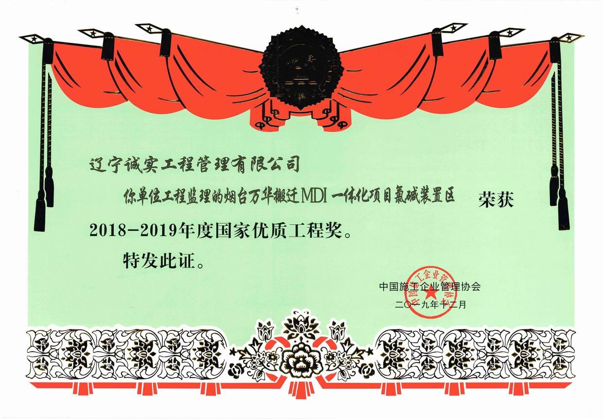 2019年12月,我單位所監(jiān)理的“煙臺萬華搬遷MDI一體化項目氯堿裝置區(qū)”被評為2018-2019年度國家優(yōu)質(zhì)工程獎、“中國石油-沙特阿美合資云南1300萬噸/年煉油項目”被評為2018-2019年度國家優(yōu)質(zhì)工程金獎。