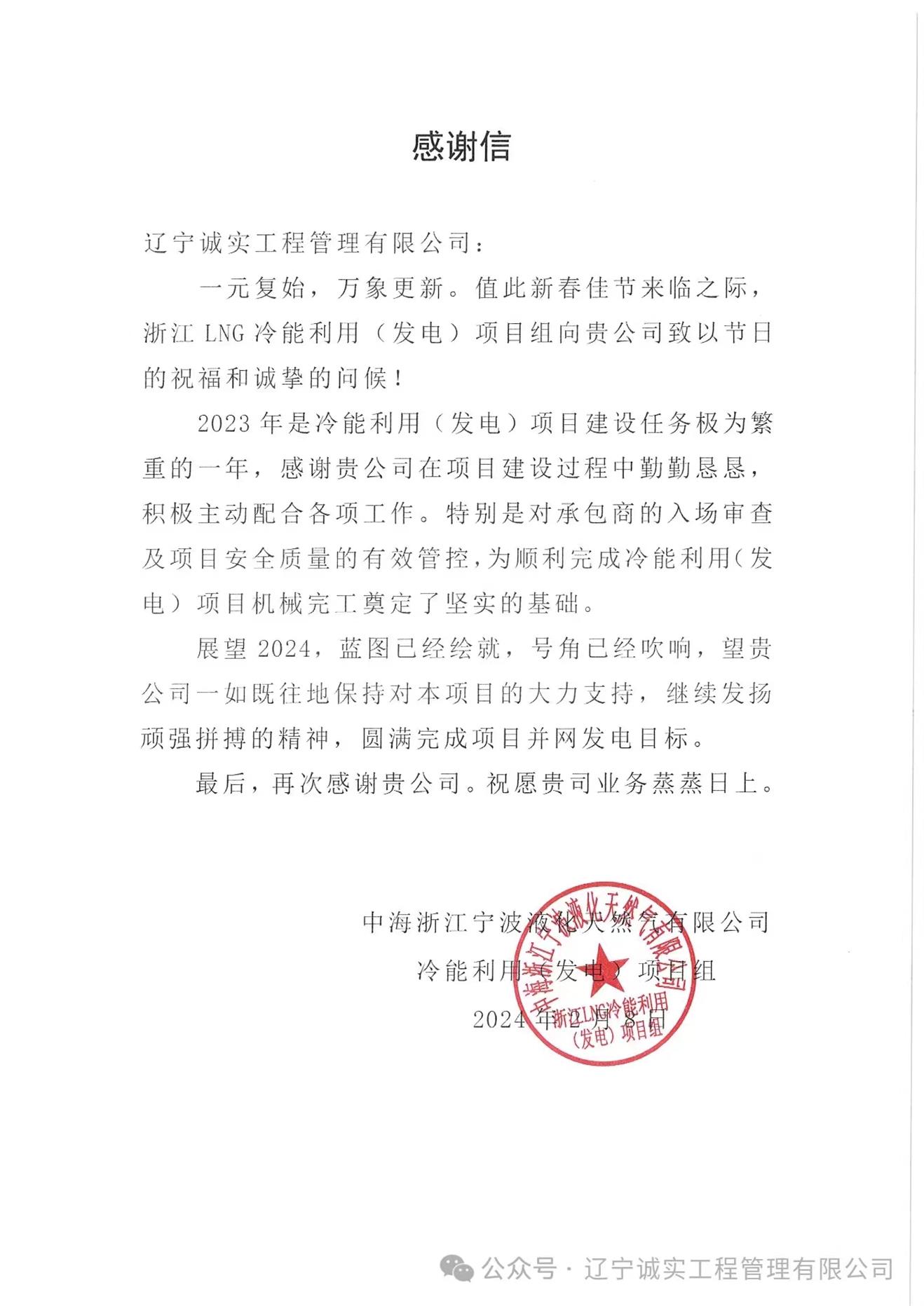 遼寧誠實2023年度承擔江蘇液化天然氣質量安全環保安全監督工作,該項目在總監張東偉的帶領下,全體成員勠力同心,克服島上工作環境不利等因素的干擾,用一絲不茍的工作態度出色地完成了本年度安全監督工作,確保了各主要工序工作的安全、順利進行。全年共發現安全問題878個,下發整改通知單86份,整改率達98%。另外,與生產設備單位協作,對承包商的安全設備設施及其附件進行定期或不定期的檢查,共計查出相關設備問題170余項,整改率達到100%,從而保證了工程項目高效安全的順利完成。充分展現了遼寧誠實大企的責任與擔當,為企業贏得了榮譽。由于項目人員出色的表現,公司于2024112日,收到了建設單位質量安全環保部的《表揚信》。
