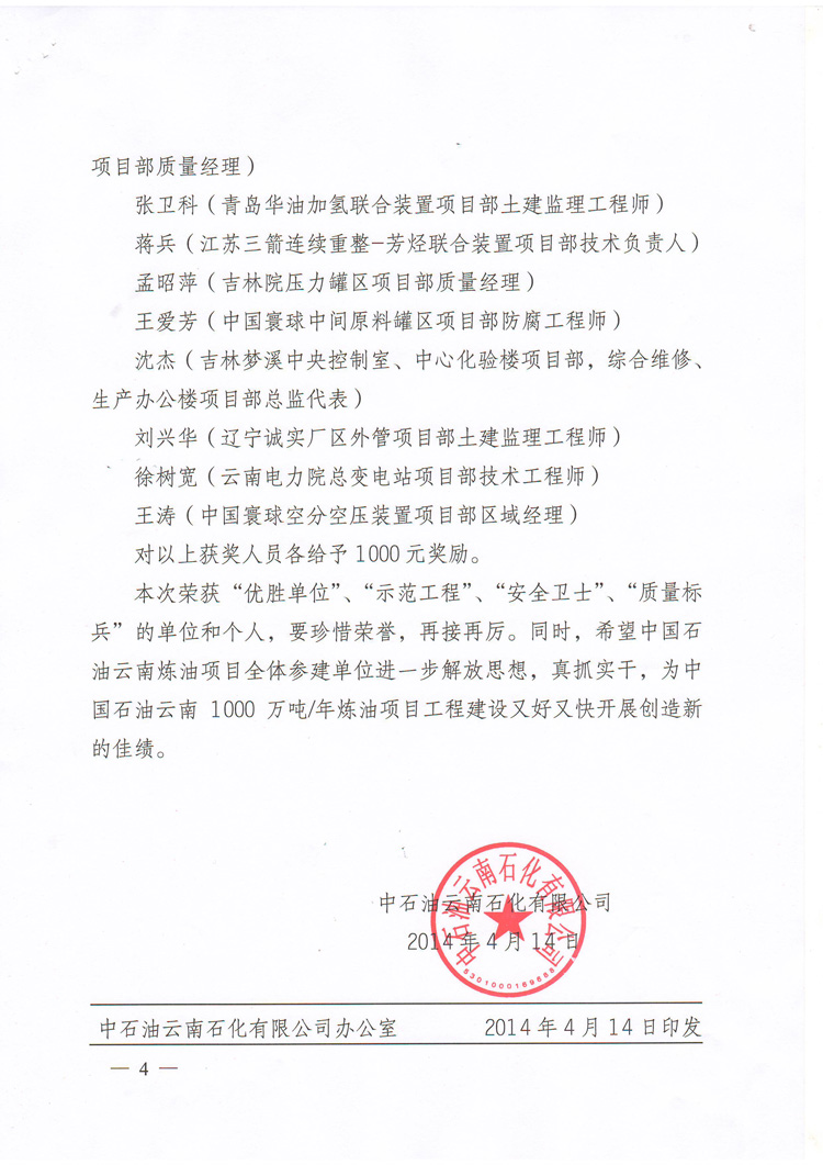 我公司榮獲中國石油云南1000萬噸/年煉油項目2014年3月份“優勝單位”稱號