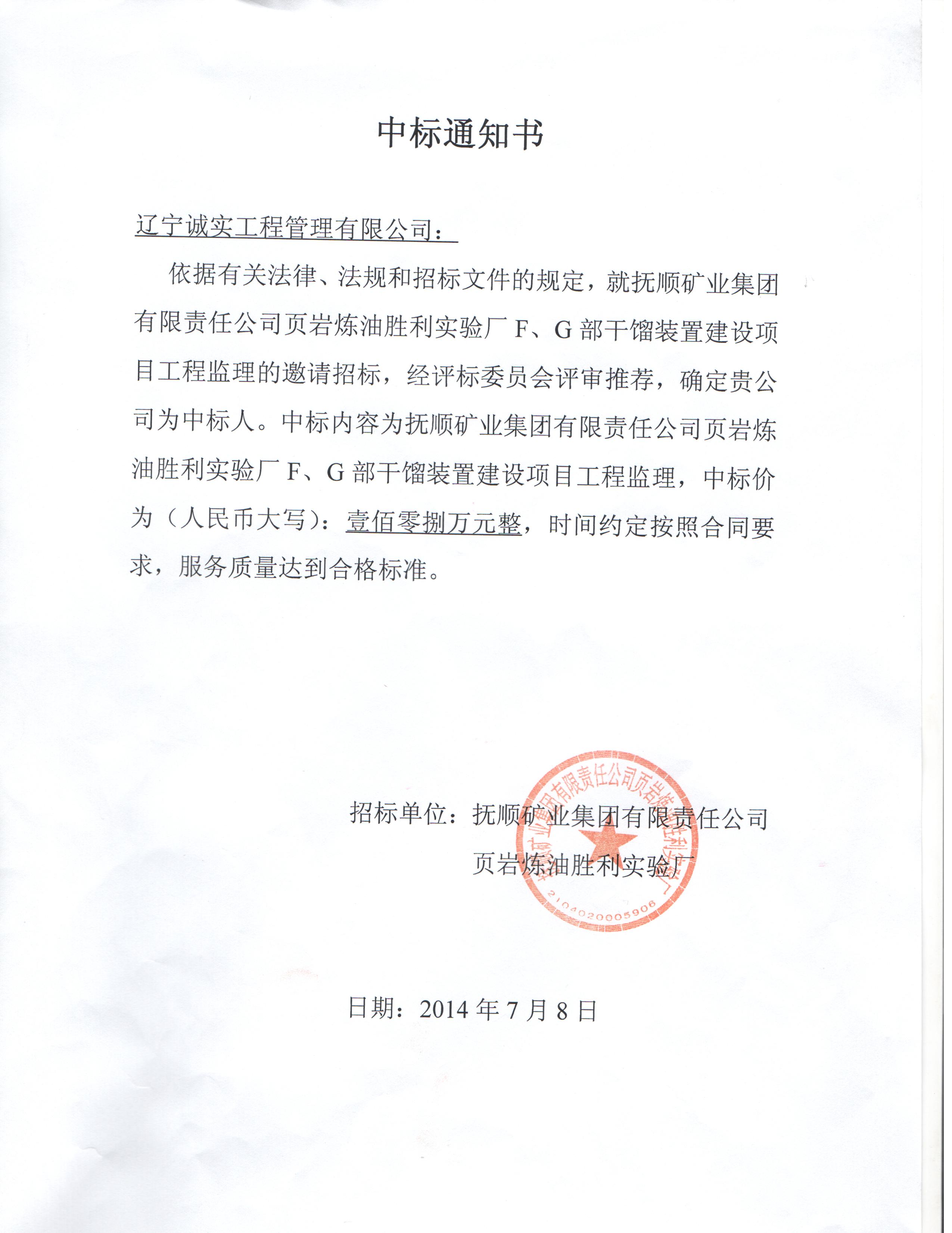 我公司成功中標(biāo)撫順礦業(yè)集團(tuán)有限責(zé)任公司頁(yè)巖煉油勝利實(shí)驗(yàn)廠F、G部干餾裝置建設(shè)項(xiàng)目工程監(jiān)理項(xiàng)目